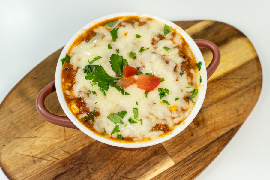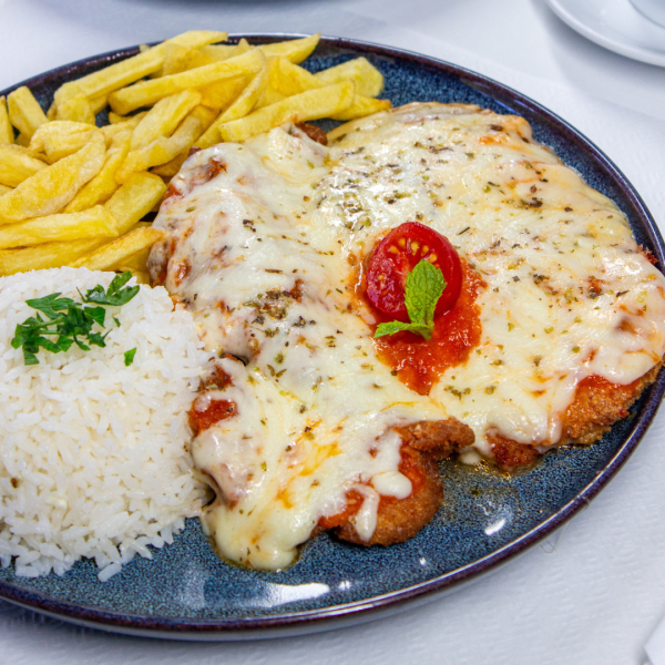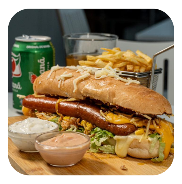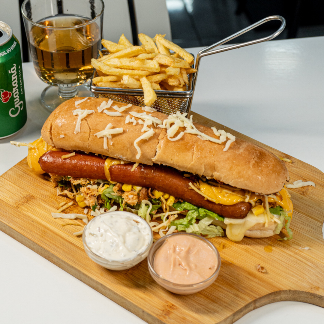 Queijo, cheddar, alface, tomate, cebola crocante, batata palha, frango, milho e molho.