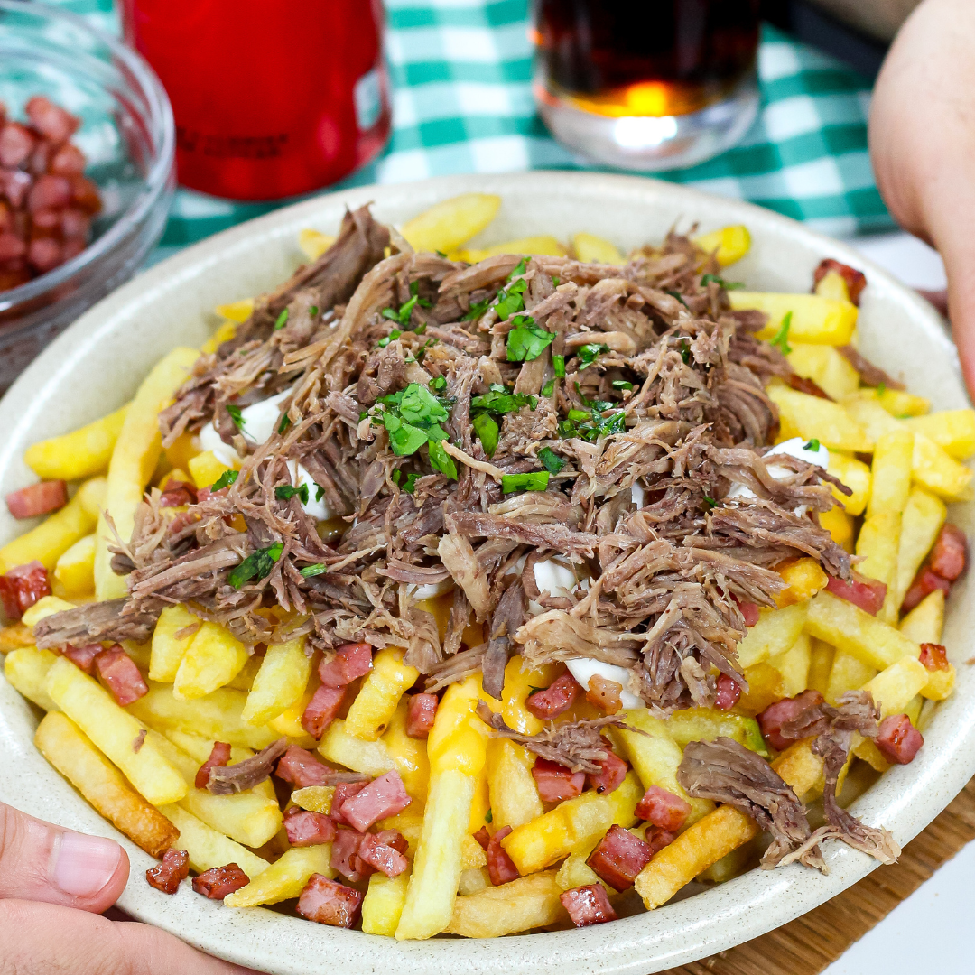Queijo, cheddar, alface, tomate, tomate, cebola crocante, bacon, carne desfiada e molho.