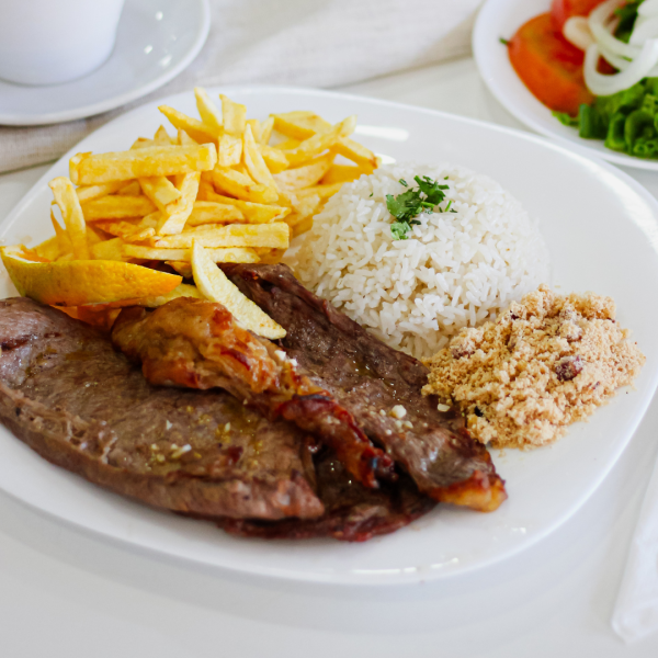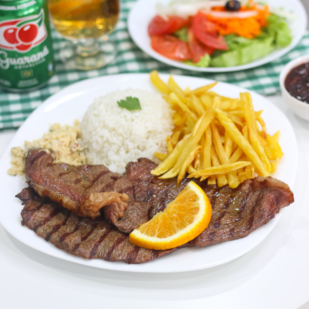 Arroz, feijão, batata, vinagrete, farofa e frutas