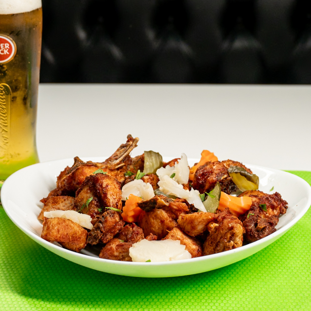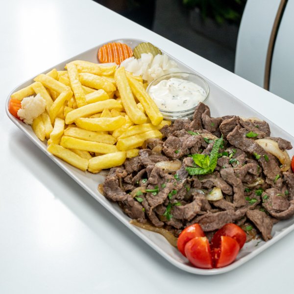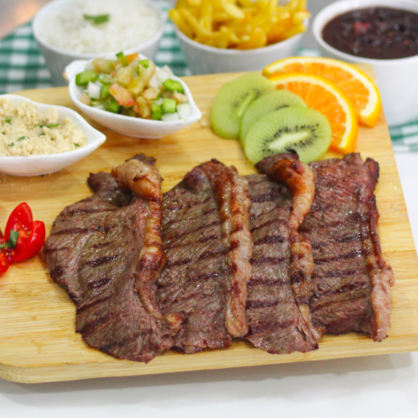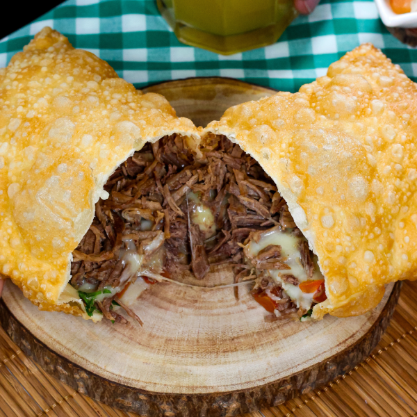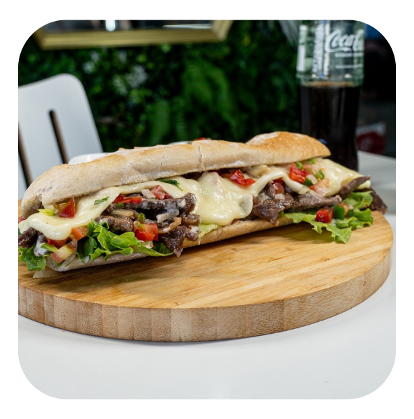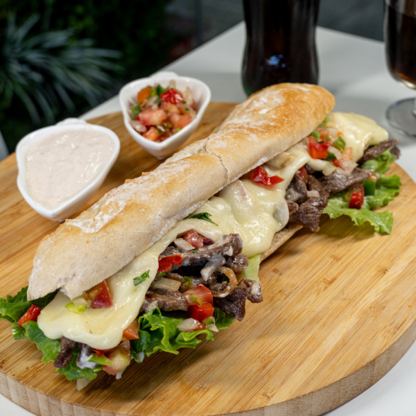 Picanha, vinagrete, queijo, cebola, alfafce e molho.