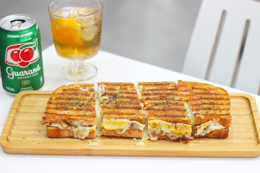 Queijo, ovo, batata palha, milho, bacon, alface, tomate e molho.