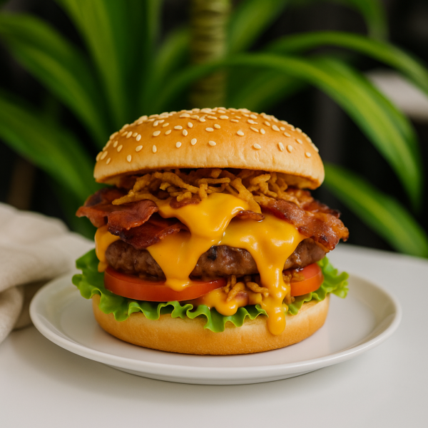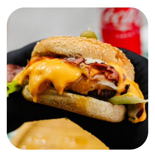 Queijo, cheddar, bacon, alface, tomate, cebola crocante e molho.